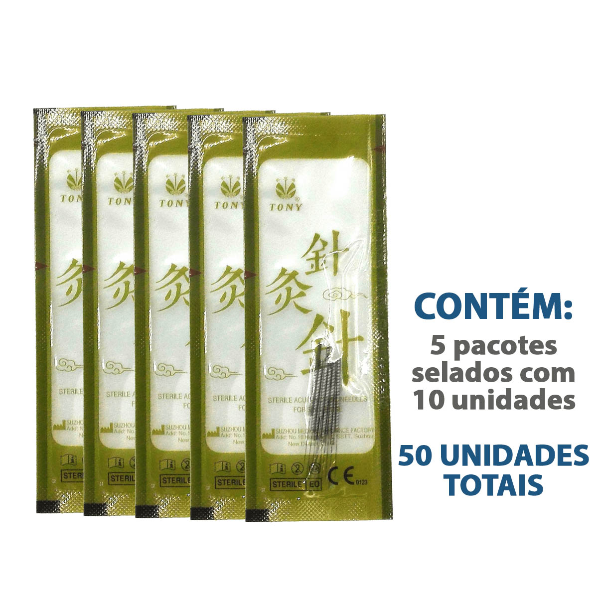 Cada caixa contém 50 agulhas, separadas em 5 pacotes selados com 10 unidades, acompanhados de tubo aplicador (mandril) que facilita a inserção.