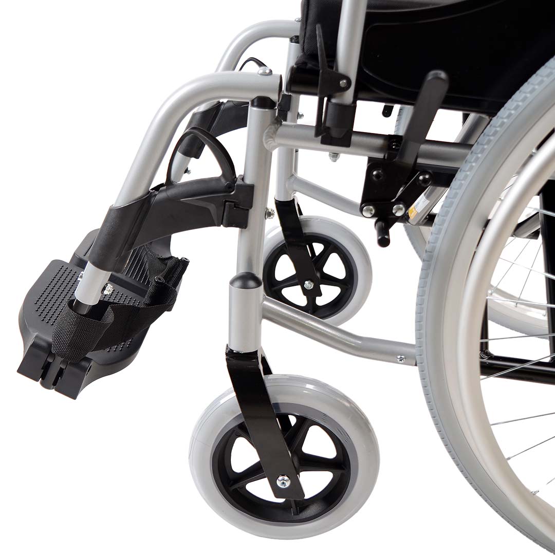 Apoio de pés/pedal: Removível, regulável e com apoio de calcanhar.